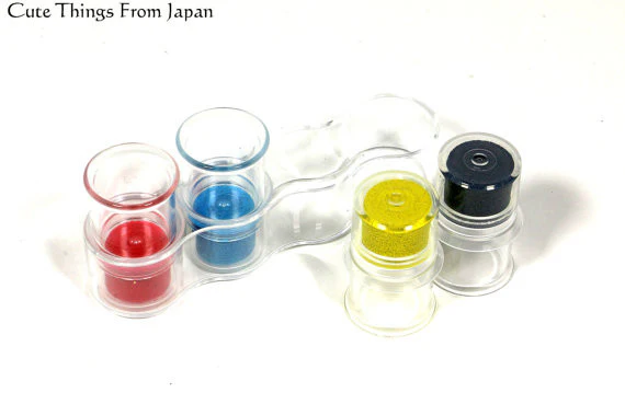 Each set comes with soramame shape color sample stickers to stick to the side of the stamp (green part) (see 2nd picture). As 5th picture shows, you can set the ink to your finger when used. The ink colors are Japanese traditional colors often used for kimonos, Japanese traditional clothes.
